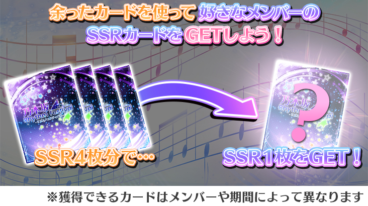 「SSR/SRトレード」とは、自分が所持しているSSR/SRカードを規定枚数消費することで、好きなメンバーのSSR/SRカードをランダムで1枚獲得することができる機能です。