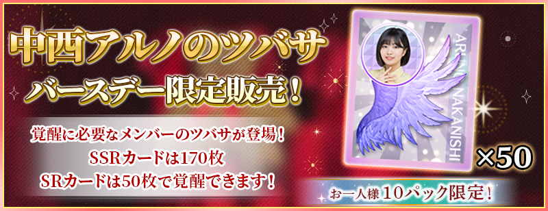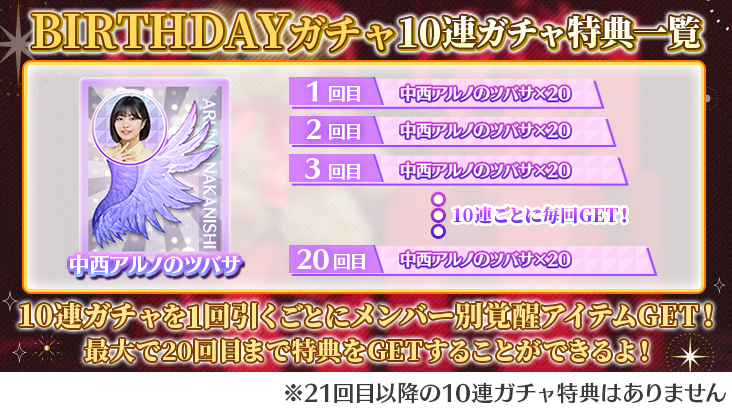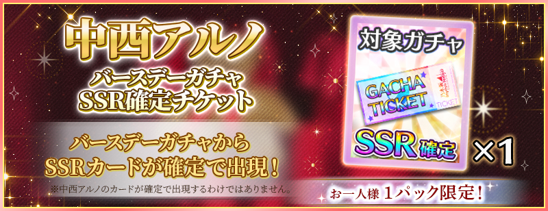 「BIRTHDAYガチャ」は中西アルノカードが高確率で出現するガチャです!