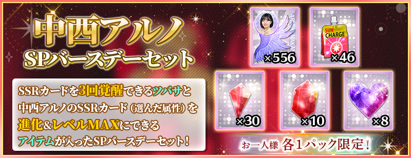「SPバースデーセット」は、中西アルノのSSRカードを3回覚醒できる分の覚醒アイテムと、中西アルノのSSRカードを進化&レベルMAXまで強化できる分の育成アイテムがセットになったスペシャルセットです!