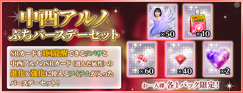 「ぷちバースデーセット」は、中西アルノのSRカードを1回覚醒できる分の覚醒アイテムと、中西アルノのSRカードを進化&レベルMAXまで強化できる分の育成アイテムがセットになったお得なセットです!