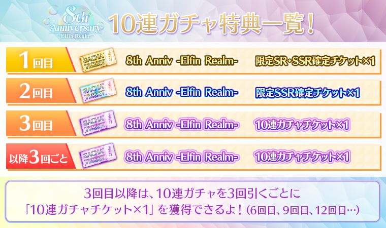 尚、8周年記念ガチャ第2弾「8th Anniversary -Elfin Realm-」全3種(A・B・C)において、10連ガチャ回数はA・B・Cそれぞれでカウントされます。