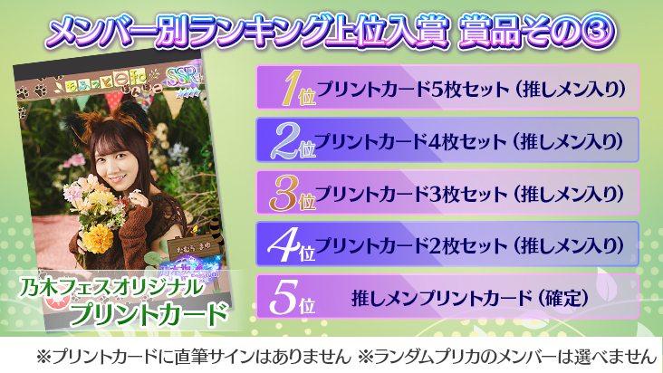 ※例えば5位のユーザー様は「推しメンプリントカード」+「ランダムプリカ1枚」が景品となります。