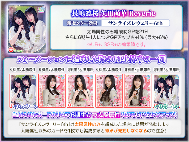【効果】指定属性のみで編成時GPを「21%」アップ、さらに編成している指定期生1人につきGPアップを「 1%」(最大 6%)