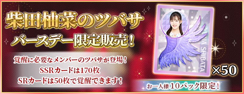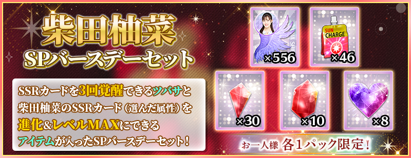 「SPバースデーセット」は、柴田柚菜のSSRカードを3回覚醒できる分の覚醒アイテムと、柴田柚菜のSSRカードを進化&レベルMAXまで強化できる分の育成アイテムがセットになったスペシャルセットです!