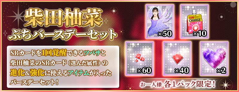 「ぷちバースデーセット」は、柴田柚菜のSRカードを1回覚醒できる分の覚醒アイテムと、柴田柚菜のSRカードを進化&レベルMAXまで強化できる分の育成アイテムがセットになったお得なセットです!