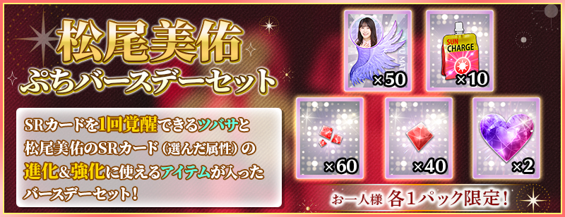 「ぷちバースデーセット」は、松尾美佑のSRカードを1回覚醒できる分の覚醒アイテムと、松尾美佑のSRカードを進化&レベルMAXまで強化できる分の育成アイテムがセットになったお得なセットです!