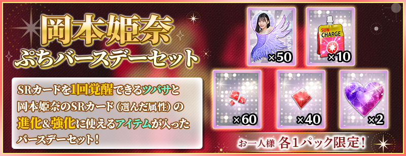 「ぷちバースデーセット」は、岡本姫奈のSRカードを1回覚醒できる分の覚醒アイテムと、岡本姫奈のSRカードを進化&レベルMAXまで強化できる分の育成アイテムがセットになったお得なセットです!