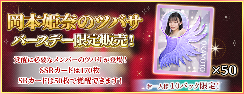 「SPバースデーセット」は、岡本姫奈のSSRカードを3回覚醒できる分の覚醒アイテムと、岡本姫奈のSSRカードを進化&レベルMAXまで強化できる分の育成アイテムがセットになったスペシャルセットです!