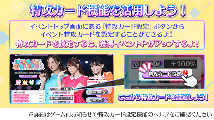 特攻効果付きカードは、イベントTOP画面にある「特攻カード設定」にカードを設定することで特攻効果を発動します!