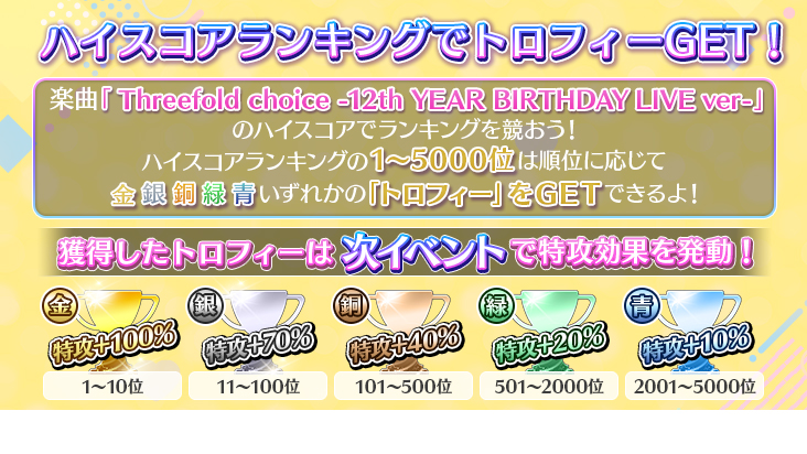 今回のイベントでは、各属性の「Threefold choice -12th YEAR BIRTHDAY LIVE ver-」の合計ハイスコアでランキングが付きます。
