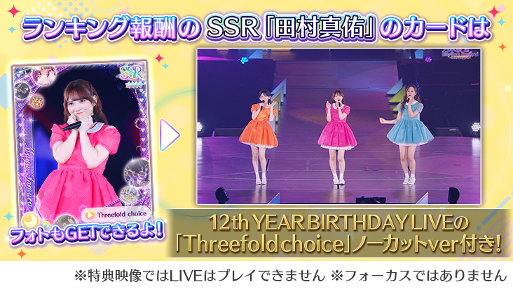 ランキング報酬には田村真佑の『Threefold choice -12thバスラ ver-ノーカットMOIVE付きSSRカード』、岩本蓮加・林瑠奈の『フォーカスMOIVE付きSRカード』が登場します!