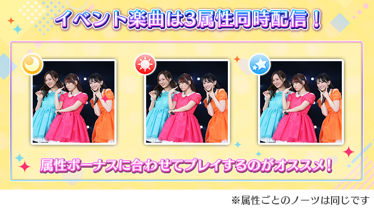 また、イベント楽曲の『Threefold choice -12th YEAR BIRTHDAY LIVE ver-』は属性ボーナス期間ごとに属性が変化します!