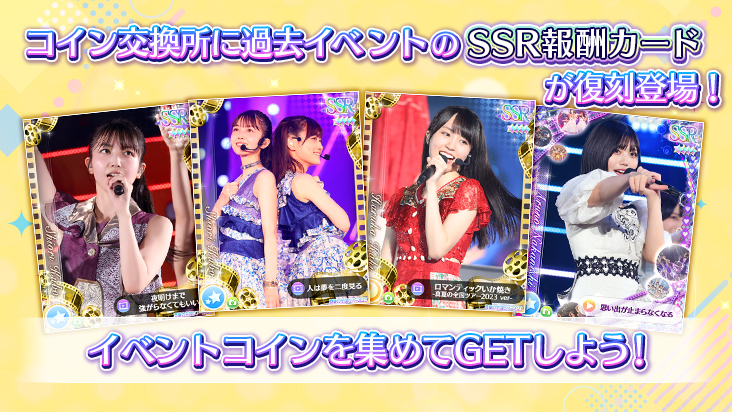 さらに!今回のイベントでは「コイン交換所」が登場し、過去のイベントで登場した報酬カードが獲得できる「8周年前夜祭記念SR推しカード確定チケット」や「豪華アイテム」などを獲得することができます!