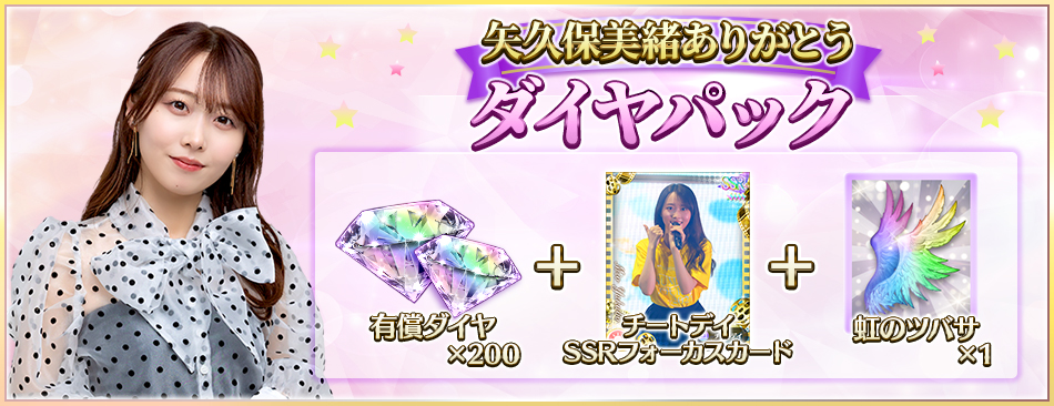 「矢久保美緒ありがとうダイヤパック」は【有償ダイヤ200個・【チートデイ】フォーカスMOVIE付きSSRカード・虹のツバサ】がセットになったお得な限定パックです!
