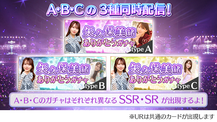 尚、期間限定ガチャ「矢久保美緒ありがとうガチャ」全3種(A・B・C)において、10連ガチャ回数はA・B・Cそれぞれでカウントされます。