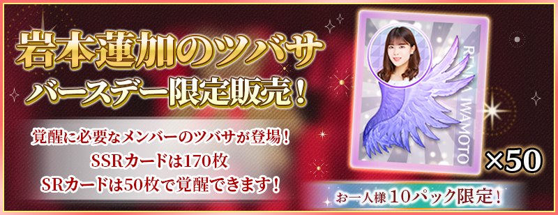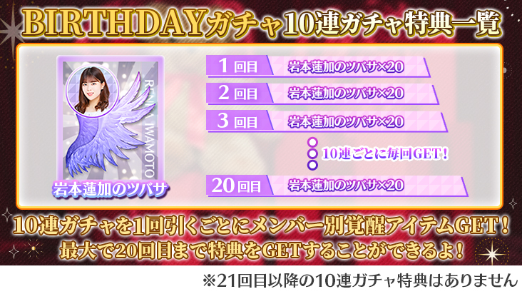 バースデーガチャの『10連』をダイヤを使用して引くと、岩本蓮加の「覚醒アイテム」を獲得することができます!