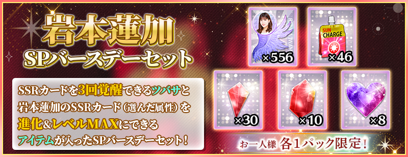 「SPバースデーセット」は、岩本蓮加のSSRカードを3回覚醒できる分の覚醒アイテムと、岩本蓮加のSSRカードを進化&レベルMAXまで強化できる分の育成アイテムがセットになったスペシャルセットです!