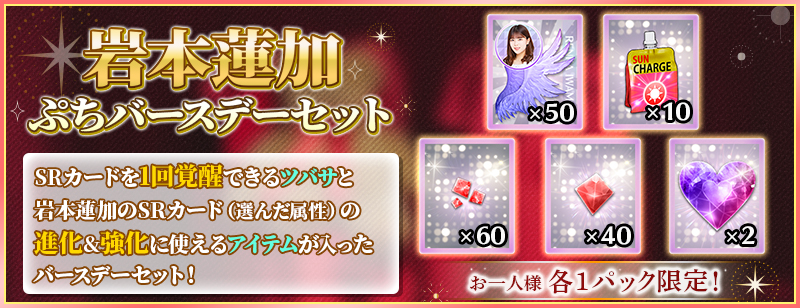 「ぷちバースデーセット」は、岩本蓮加のSRカードを1回覚醒できる分の覚醒アイテムと、岩本蓮加のSRカードを進化&レベルMAXまで強化できる分の育成アイテムがセットになったお得なセットです!
