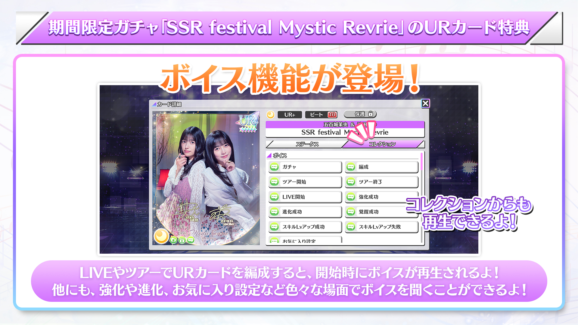 URカードをデッキやツアーに編成すると、LIVE開始時、ツアー終了時などにメンバーの限定ボイスを聴くことができます!