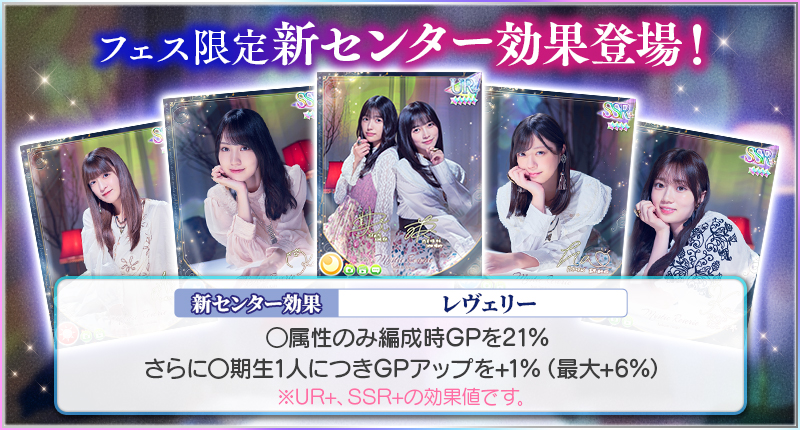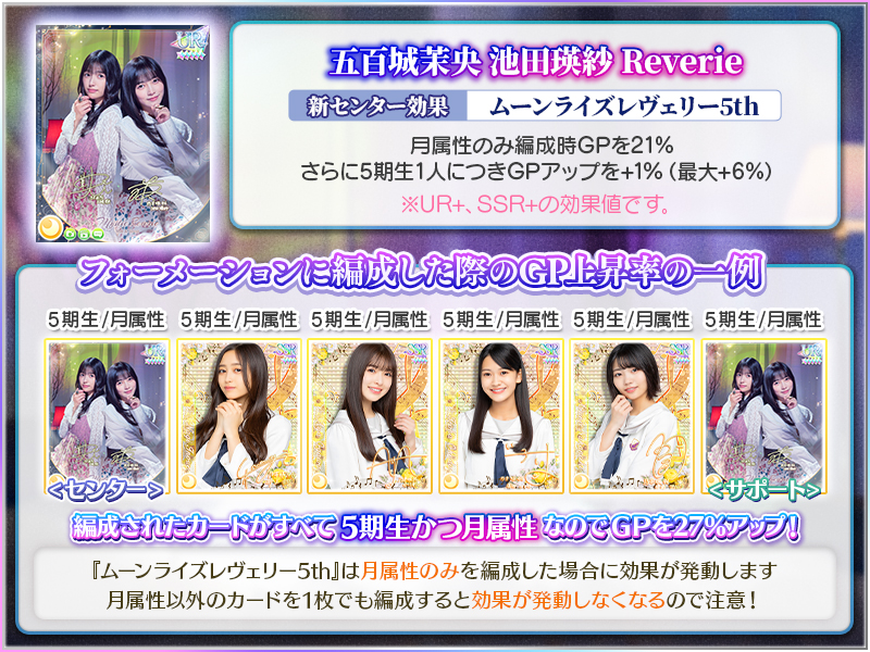 【効果】指定属性のみで編成時GPを「21%」アップ、さらに編成している指定期生1人につきGPアップを「 1%」(最大 6%)
