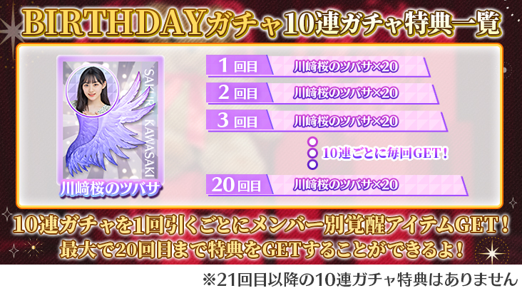 バースデーガチャの『10連』をダイヤを使用して引くと、川﨑桜の「覚醒アイテム」を獲得することができます!