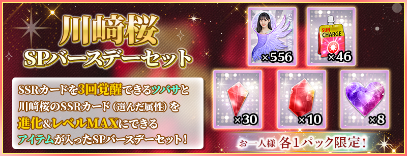 「SPバースデーセット」は、川﨑桜のSSRカードを3回覚醒できる分の覚醒アイテムと、川﨑桜のSSRカードを進化&レベルMAXまで強化できる分の育成アイテムがセットになったスペシャルセットです!