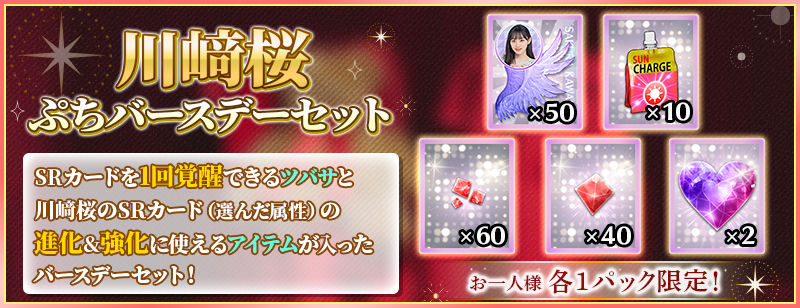 「ぷちバースデーセット」は、川﨑桜のSRカードを1回覚醒できる分の覚醒アイテムと、川﨑桜のSRカードを進化&レベルMAXまで強化できる分の育成アイテムがセットになったお得なセットです!