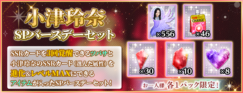 「SPバースデーセット」は、小津玲奈のSSRカードを3回覚醒できる分の覚醒アイテムと、小津玲奈のSSRカードを進化&レベルMAXまで強化できる分の育成アイテムがセットになったスペシャルセットです!