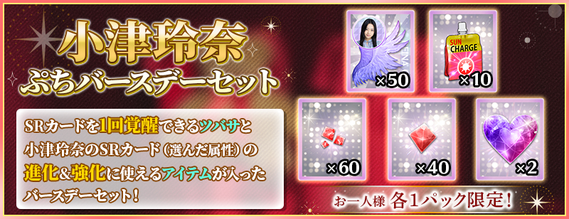 「ぷちバースデーセット」は、小津玲奈のSRカードを1回覚醒できる分の覚醒アイテムと、小津玲奈のSRカードを進化&レベルMAXまで強化できる分の育成アイテムがセットになったお得なセットです!