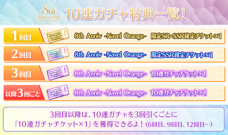 尚、8周年ガチャ第1弾「8th Anniversary -Navel Orange-」全3種(A・B・C)において、10連ガチャ回数はA・B・Cそれぞれでカウントされます。