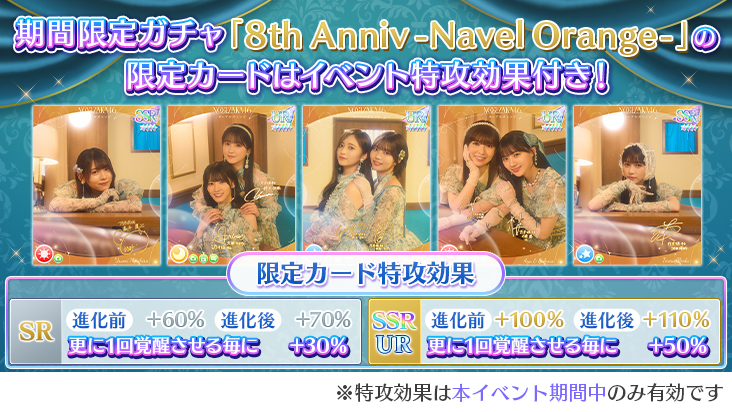 8周年カード「8th Anniversary -Navel Orange-」の一部カードには、強力なセンター効果&新スキルが付いています!
