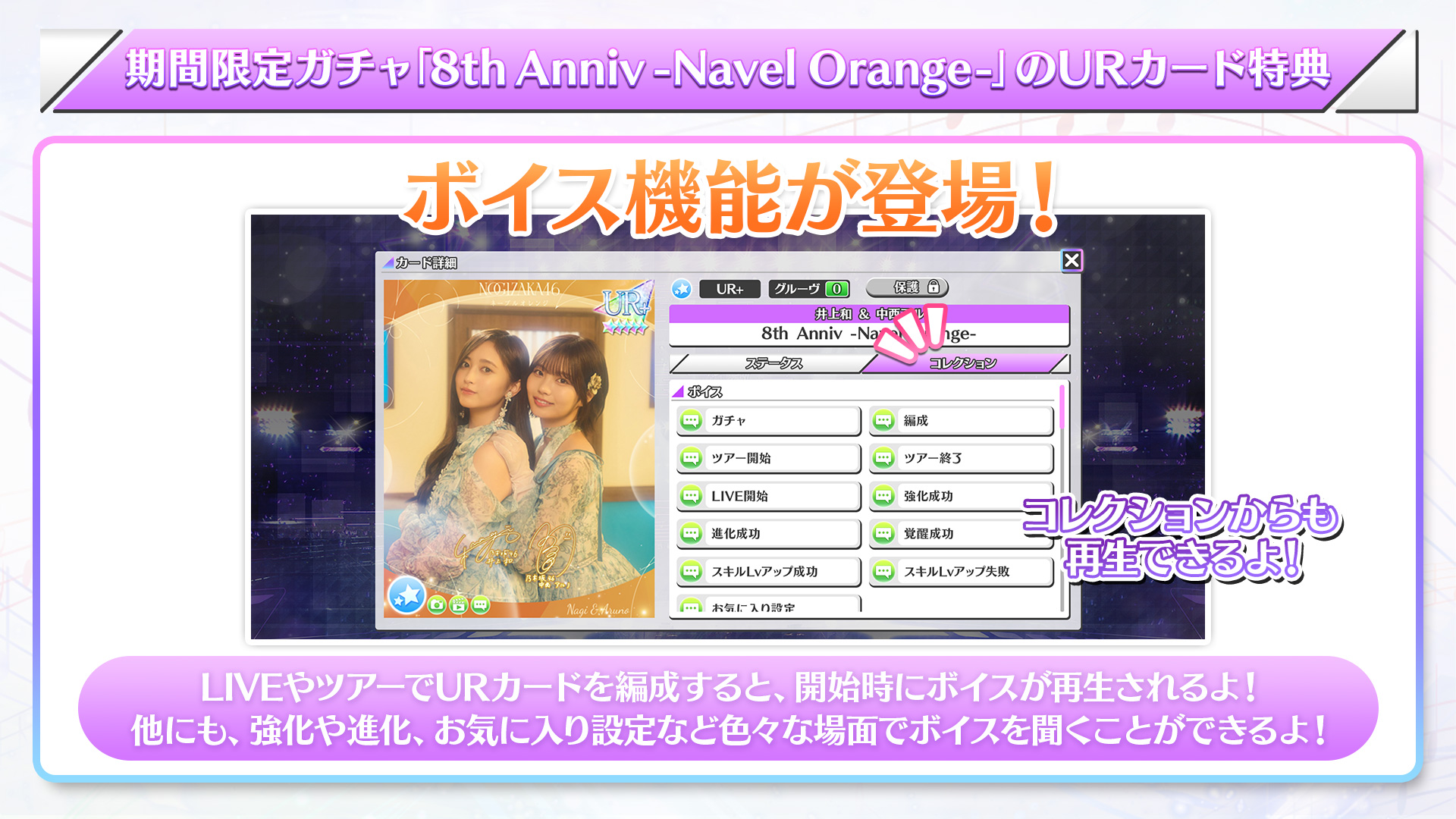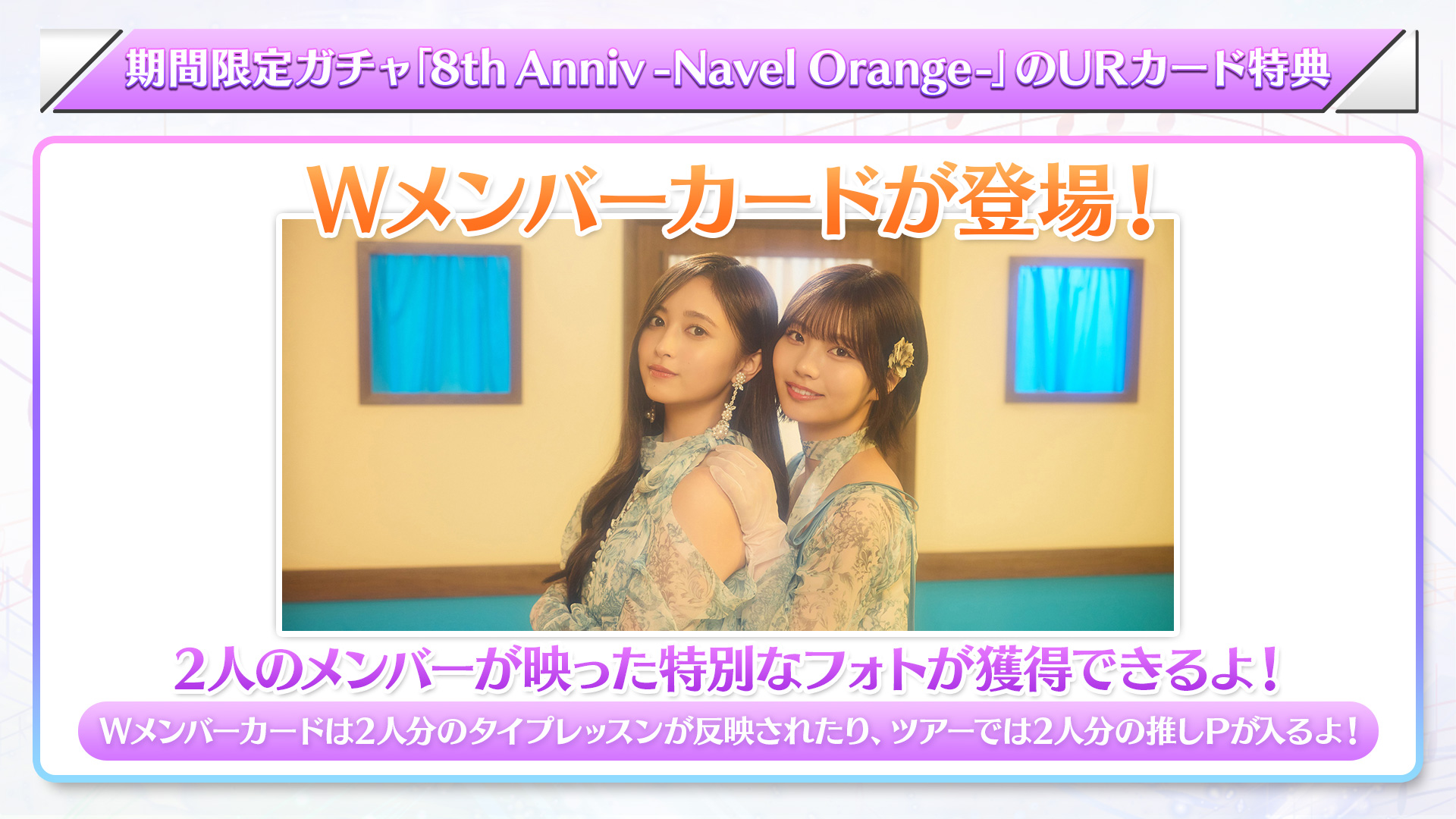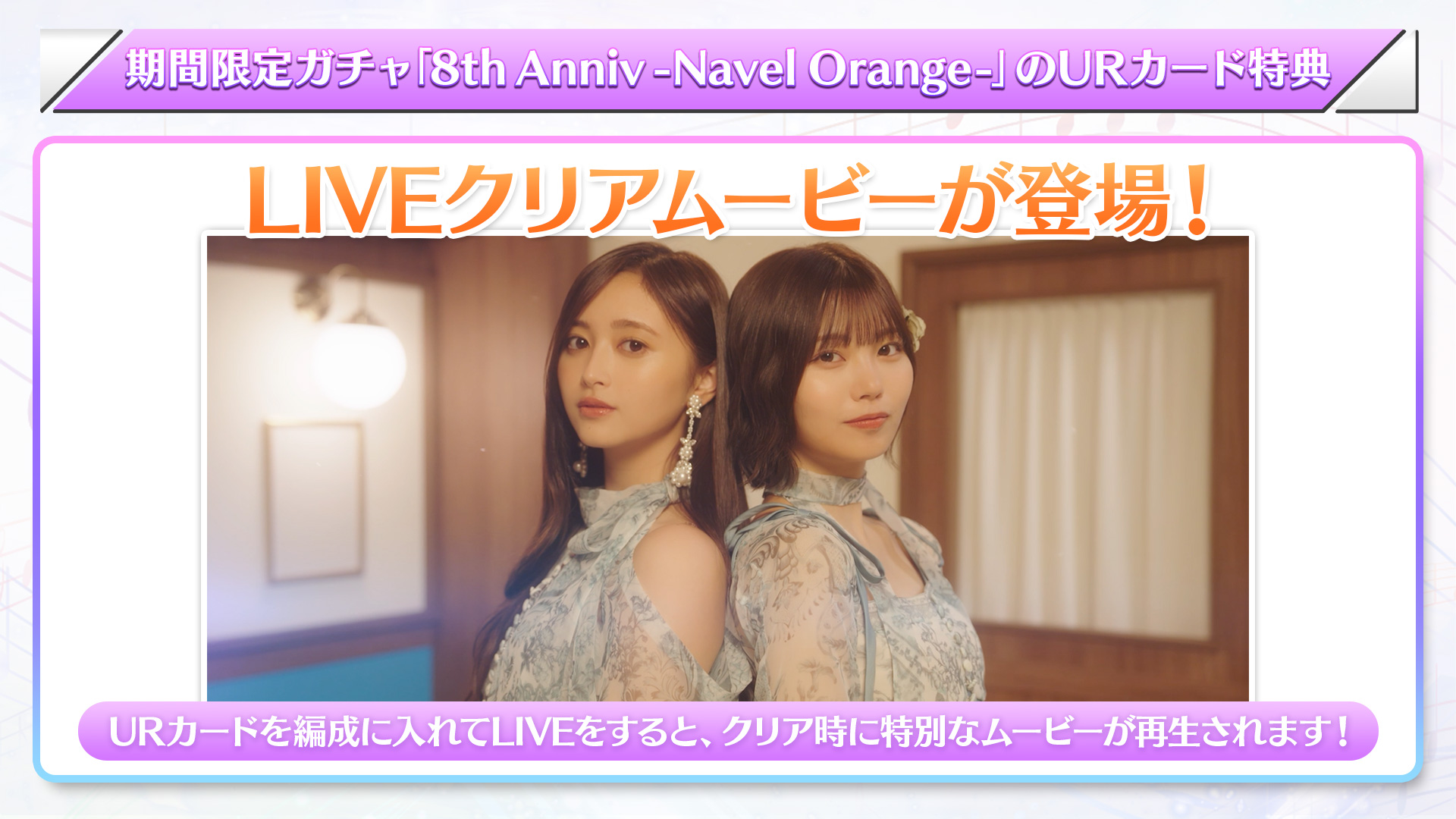 8周年記念ガチャからは、38thシングル「ネーブルオレンジ」をテーマにした『記念カード』が登場!