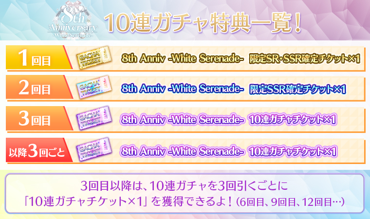 尚、8周年ガチャ第1弾「8th Anniversary -White Serenade-」全3種(A・B・C)において、10連ガチャ回数はA・B・Cそれぞれでカウントされます。