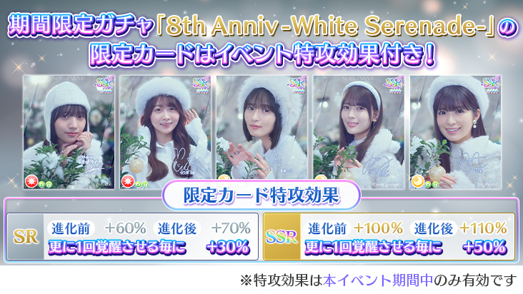 12/15(月)より、乃木フェス8周年を記念したガチャ第3弾「8th Anniversary -White Serenade-」を開催いたします!