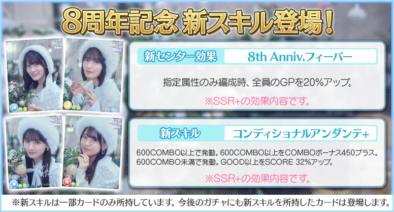 8周年カード「8th Anniversary -White Serenade-」の一部カードには、強力なセンター効果&新スキルが付いています!