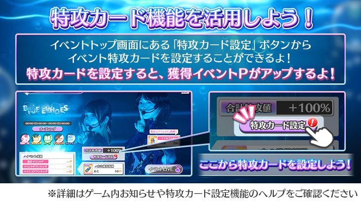 特攻効果付きカードは、イベントTOP画面にある「特攻カード設定」にカードを設定することで特攻効果を発動します!