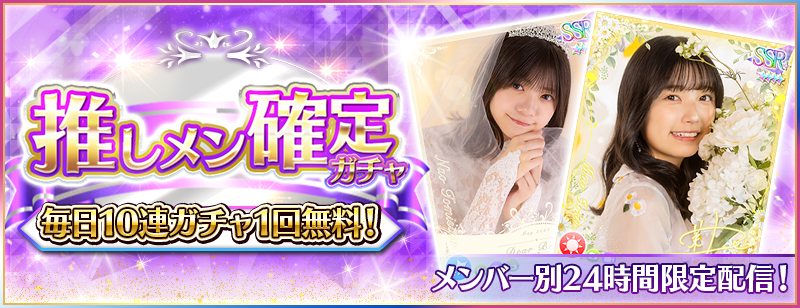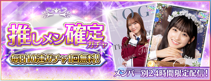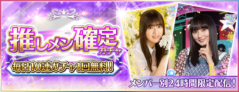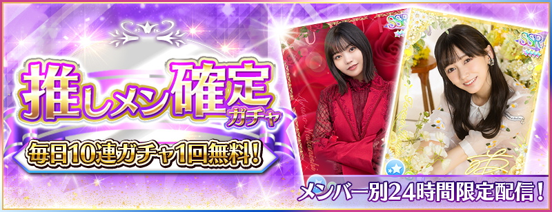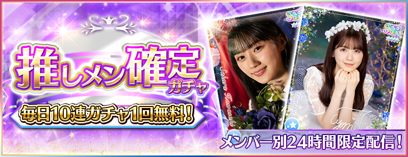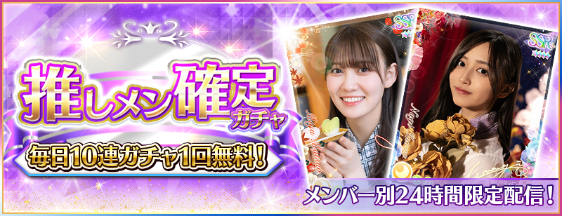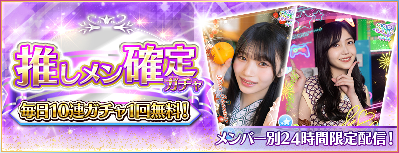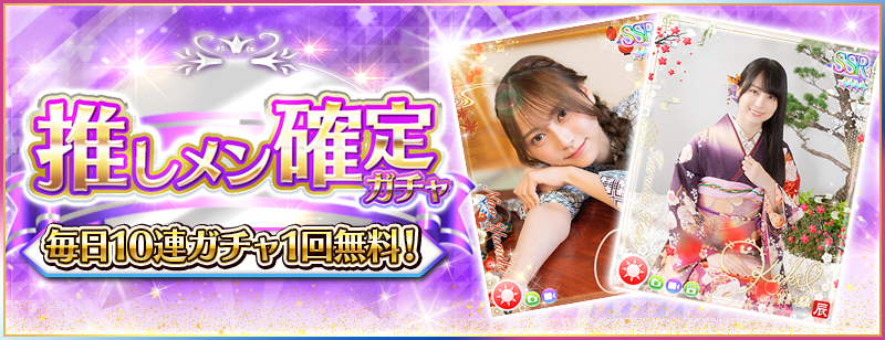 ※Rank10未満のユーザー様は「Rank10到達時点」より無料10連で日替わり推しメン確定ガチャを引けるようになります。