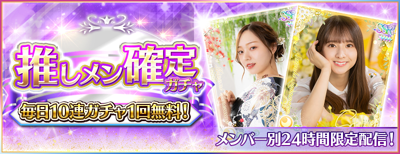 ただし、無料10連は1日1回までなので、全てのメンバーの『日替わり推しメン確定ガチャ』を無料で引けるわけではありません。