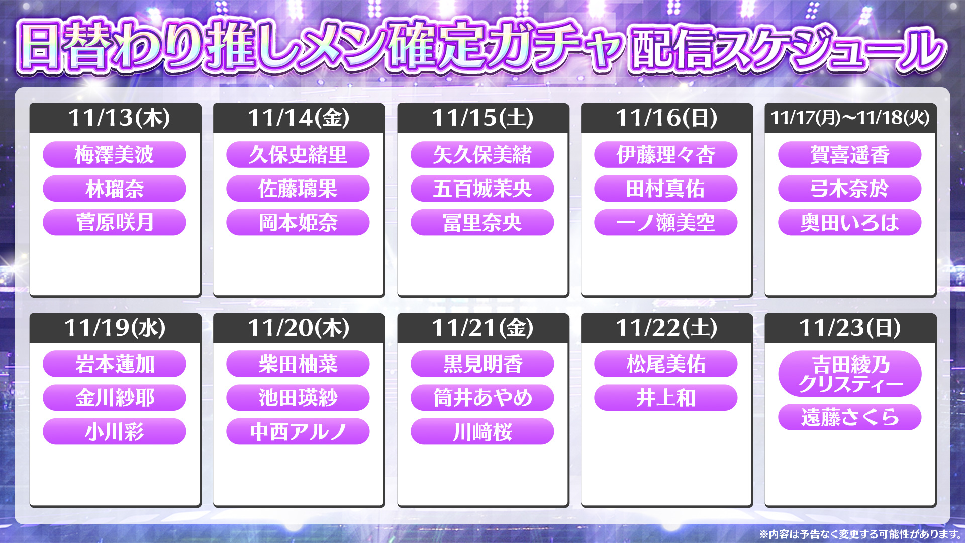 11/13(木)~ 11/23(日)まで、1日あたり2人~3人のメンバーの『日替わり推しメン確定ガチャ』を配信します!
