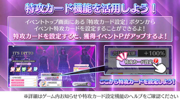 特攻効果付きカードは、イベントTOP画面にある「特攻カード設定」にカードを設定することで特攻効果を発動します!