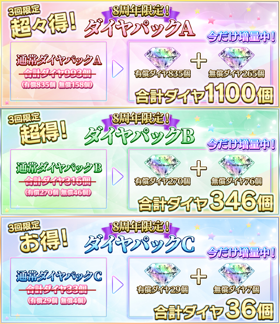 また上記の他にも8周年を記念した特別なダイヤパックを販売!