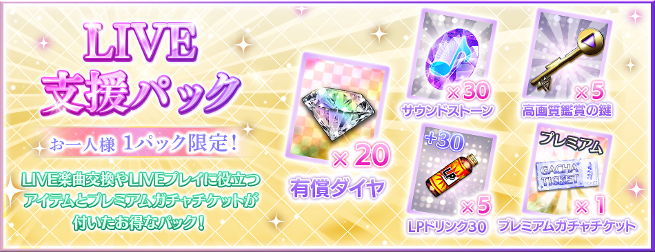 「LIVE支援パック」は、有償ダイヤ20個とサウンドストーン30個、プレミアムガチャチケットなどのアイテムがセットになったお得な限定パックです!