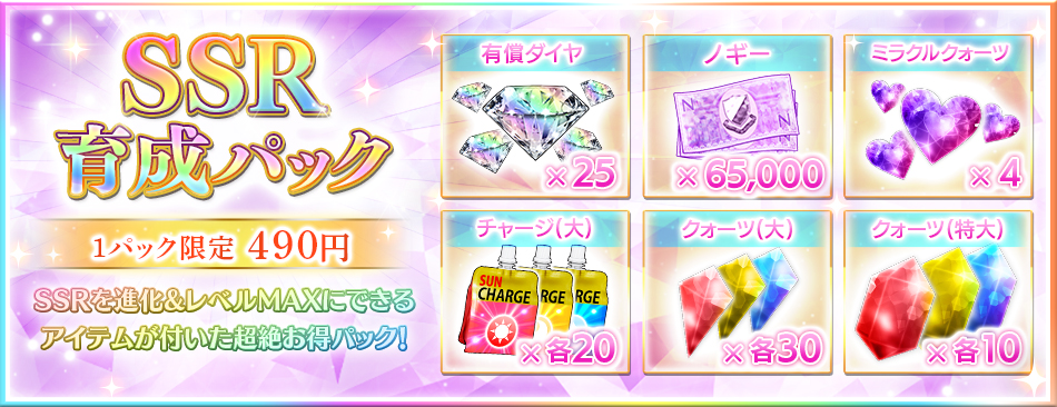 「SSR育成パック」は、有償ダイヤ25個とSSRカードを進化させた後、レベルMAXまで強化できる分の育成アイテムがセットになったお得な限定パックです!
