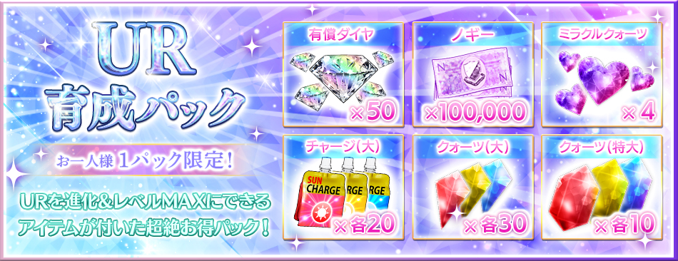 「UR育成パック」は、有償ダイヤ50個とURカードを進化させた後、レベルMAXまで強化できる分の育成アイテムがセットになったお得な限定パックです!