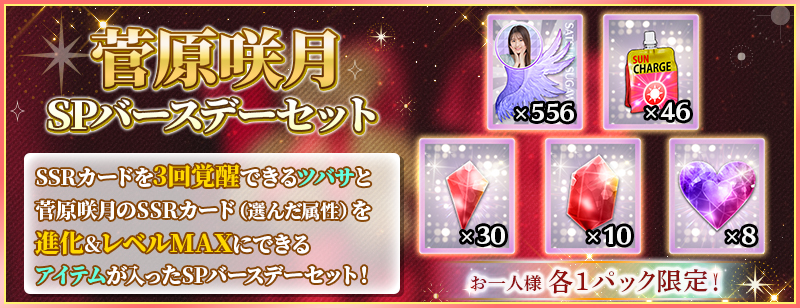 「SPバースデーセット」は、菅原咲月のSSRカードを3回覚醒できる分の覚醒アイテムと、菅原咲月のSSRカードを進化&レベルMAXまで強化できる分の育成アイテムがセットになったスペシャルセットです!