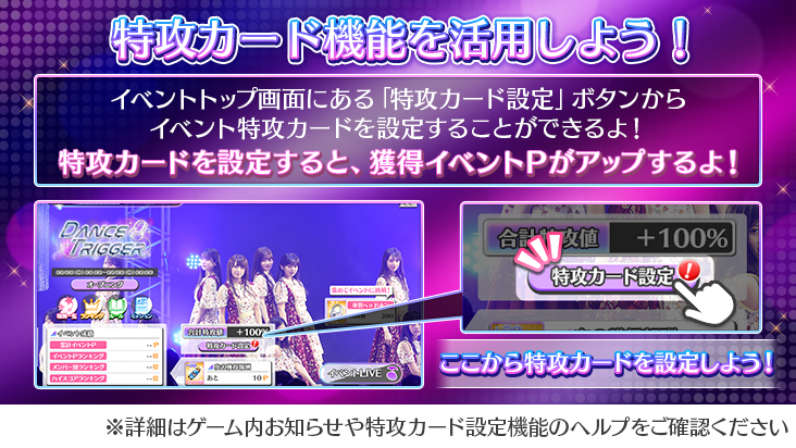 特攻効果付きカードは、イベントTOP画面にある「特攻カード設定」にカードを設定することで特攻効果を発動します!