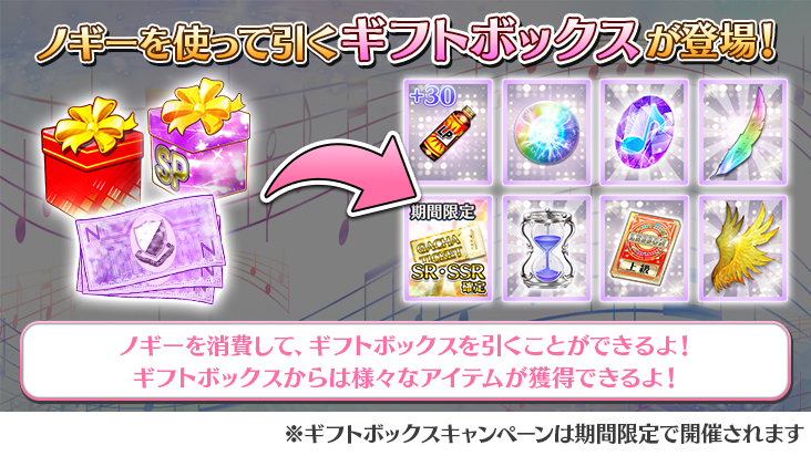 「ギフトボックス」とはノギーを消費することで様々なアイテムが獲得できる『ギフト』を引けるコンテンツになります!