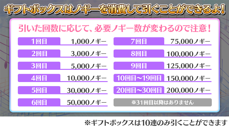 ギフトボックスを引くために必要なノギー数は以下の通りです。