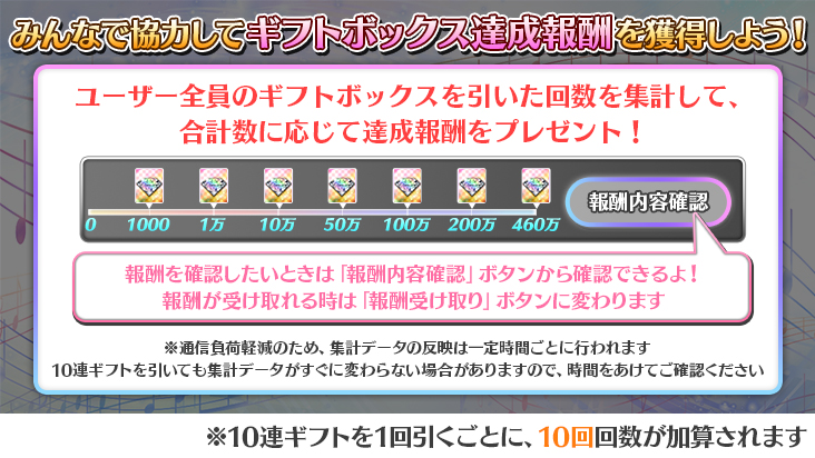 ユーザー全員のギフトボックスを引いた回数を集計して、合計数に応じて達成報酬をプレゼント!
