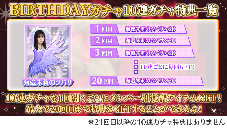 ※本バースデーガチャチケットは対象メンバーのバースデーガチャの10連のみ引くことができます。